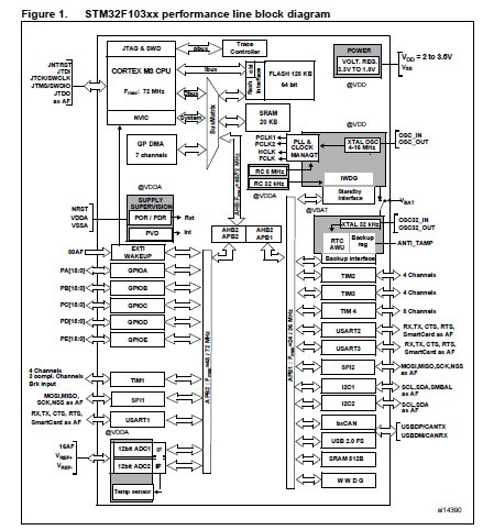 The STM32F103VBT6 performance line family incorporates the high-performance ARM Cortex-M3 32-bit RISC core operating at a 72 MHz frequency, high-speed embedded memories (Flash memory up to 128Kbytes and SRAM up to 20 Kbytes), and an extensive range of enhanced I/Os and peripherals connected to two APB buses. The STM32F103VBT6 offers two 12-bit ADCs, three general purpose 16-bit timers plus one PWM timer, as well as standard and advanced communication interfaces: up to two I2Cs and SPIs, three USARTs, an USB and a CAN. The STM32F103VBT6 performance line family operates in the -40 to +105℃ temperature range, from a 2.0 to 3.6 V power supply.